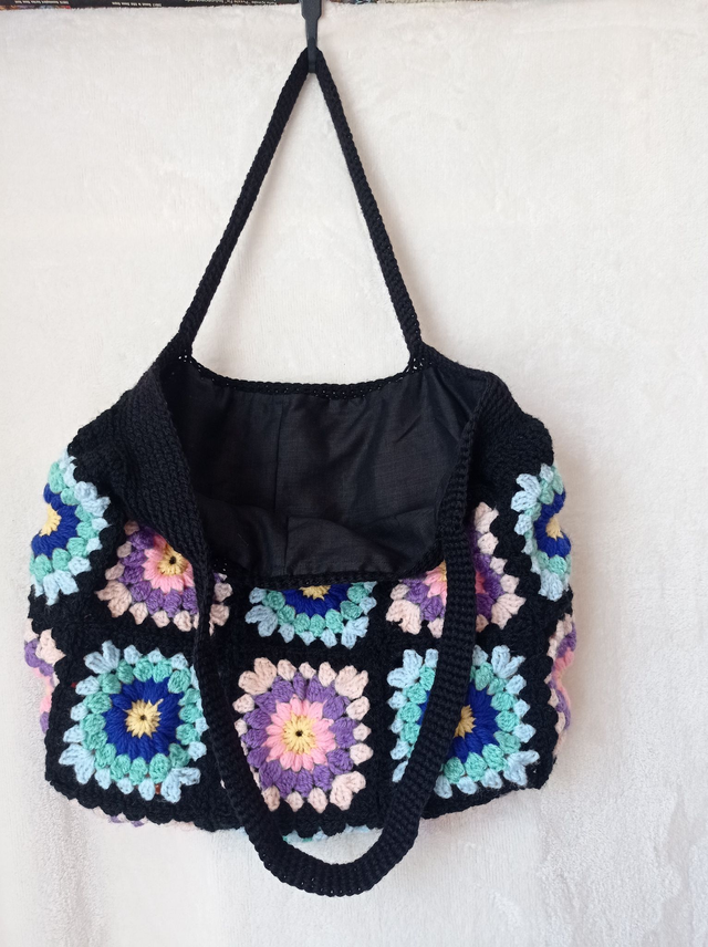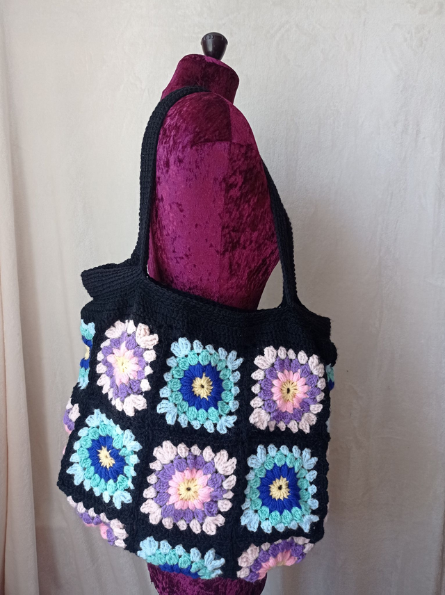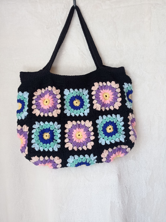 Sac tote bag en granny squares starburst en fil acrylique et doublé en coton.